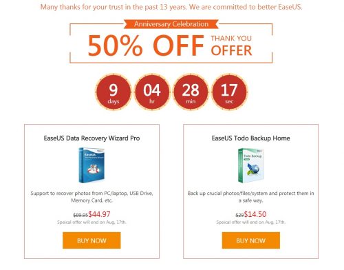 A su vez EaseUS como motivo de celebración, ofrece la posibilidad de acceder a la oferta del software EaseUS Data Recovery Wizard Pro a tan solo 44,97 dolares (50% descuento) o el software EaseUS Todo Backup Home a 14,50 dolares.