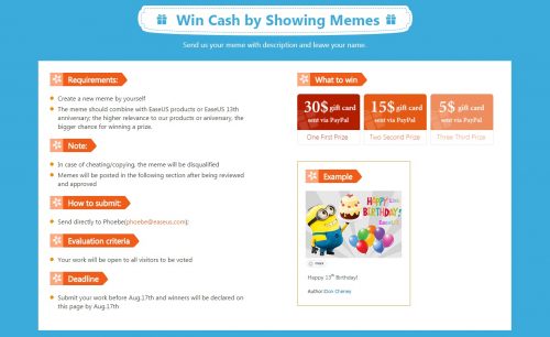Por último existe una tercera campaña que ofrece EaseUS por su aniversario y se trata de ganar dinero mostrando tu meme. Dicho meme debe combinarse con alguno de los productos de la compañía o el 13° aniversario de EaseUS. Es decir que tienes la oportunidad de ganar como primer premio 30 dolares, segundo premio 15 dolares y 5 dolares como tercer premio que podrán recibirse a través de Paypal.